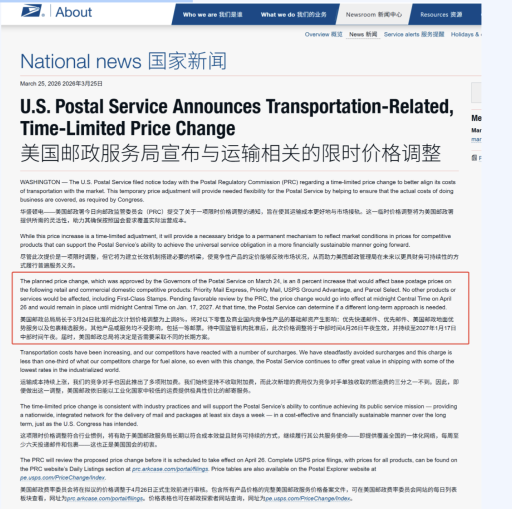 3月25日,美国邮政服务(USPS)宣布自4月26日起对包裹业务价格上调8%,持续至2027年1月17日,以应对能源和运输成本上涨。